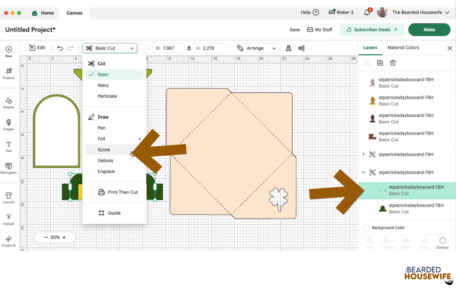 Scroll down the list in the LAYERS panel and find the envelope. Click the fold line and change the fold lines to score lines by changing the OPERATION from BASIC CUT to SCORE.