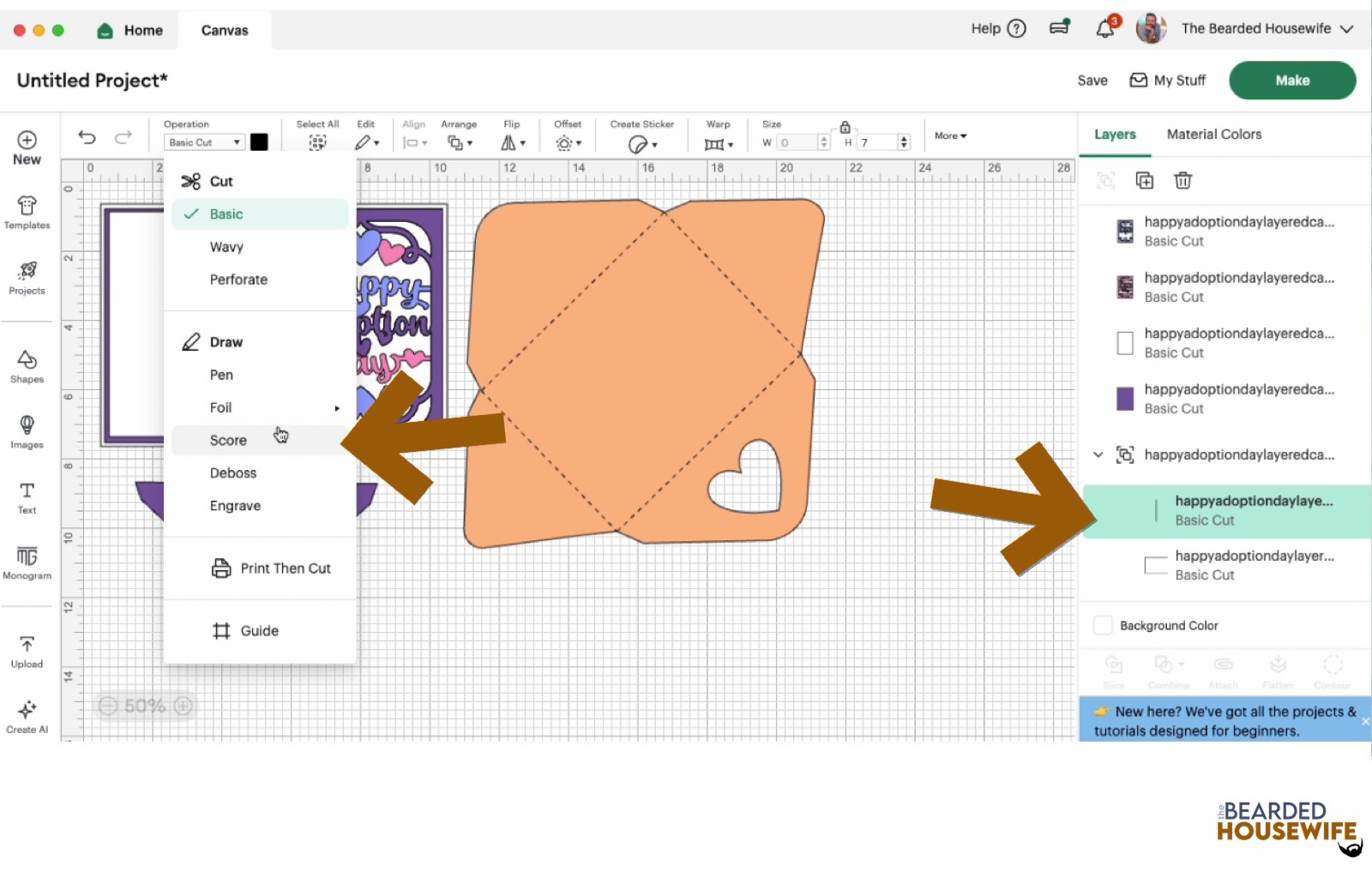 Scroll down the list in the LAYERS panel and find the envelope. Click the fold line and change the fold lines to score lines by changing the OPERATION from BASICCUT to SCORE.