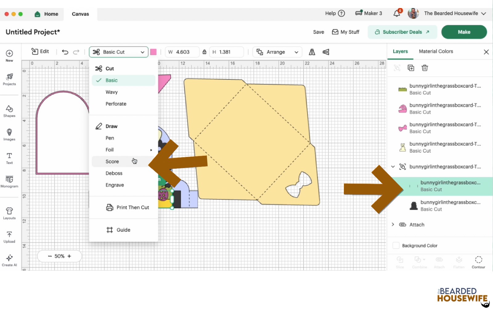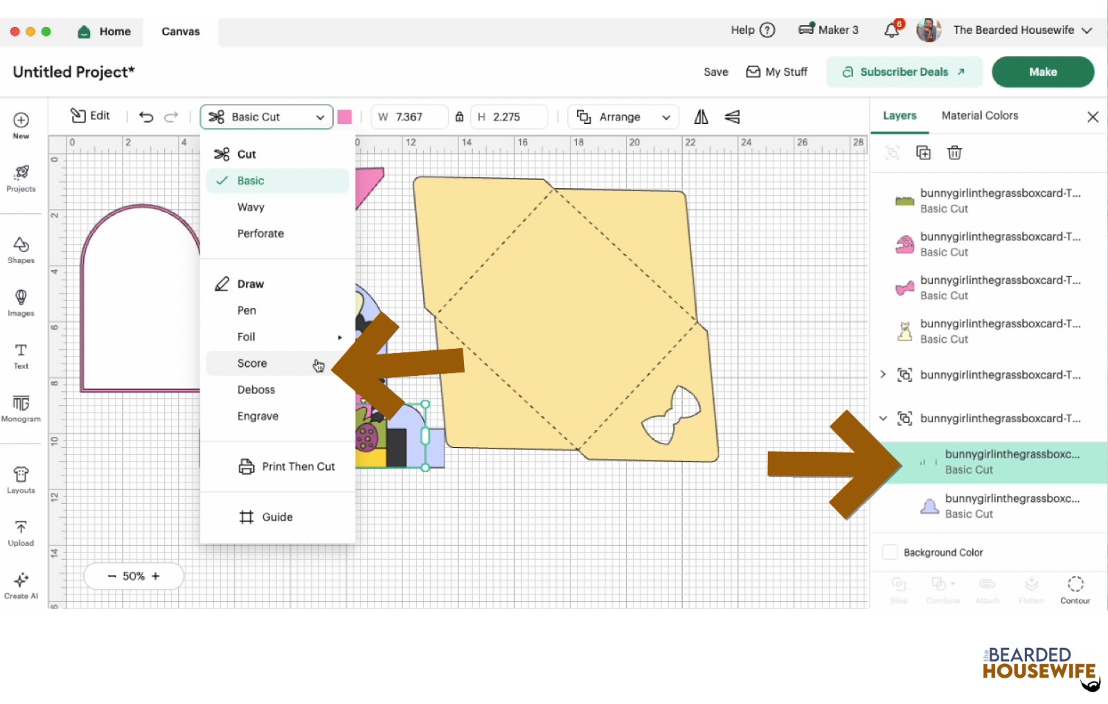 Scroll down the list in the LAYERS panel and find the envelope. Click the fold line and change the fold lines to score lines by changing the OPERATION from BASICCUT to SCORE.