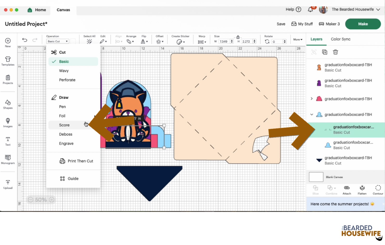 Scroll down the list in the LAYERS panel and find the envelope. Click the fold line and change the fold lines to score lines by changing the OPERATION from BASIC CUT to SCORE.