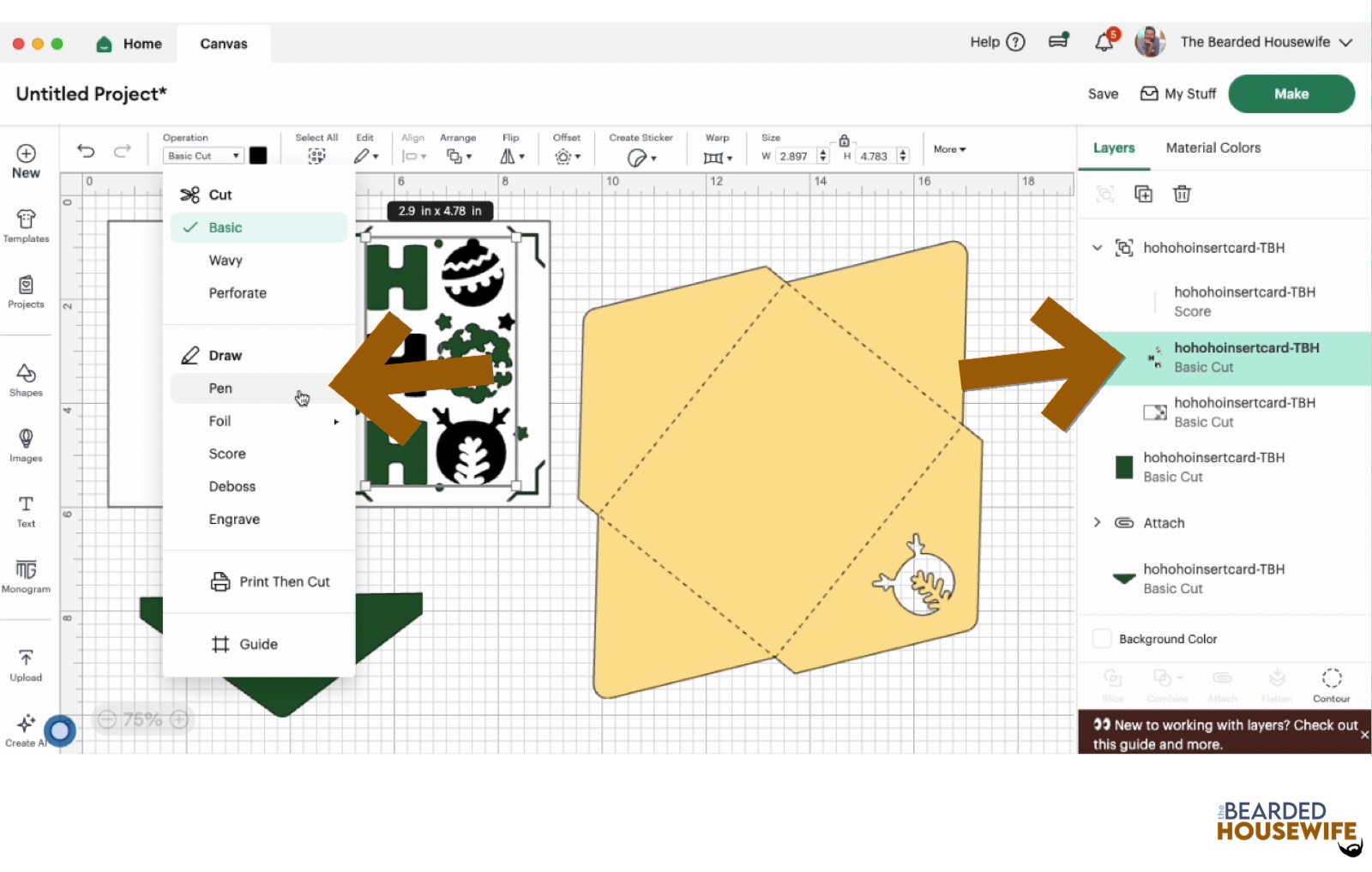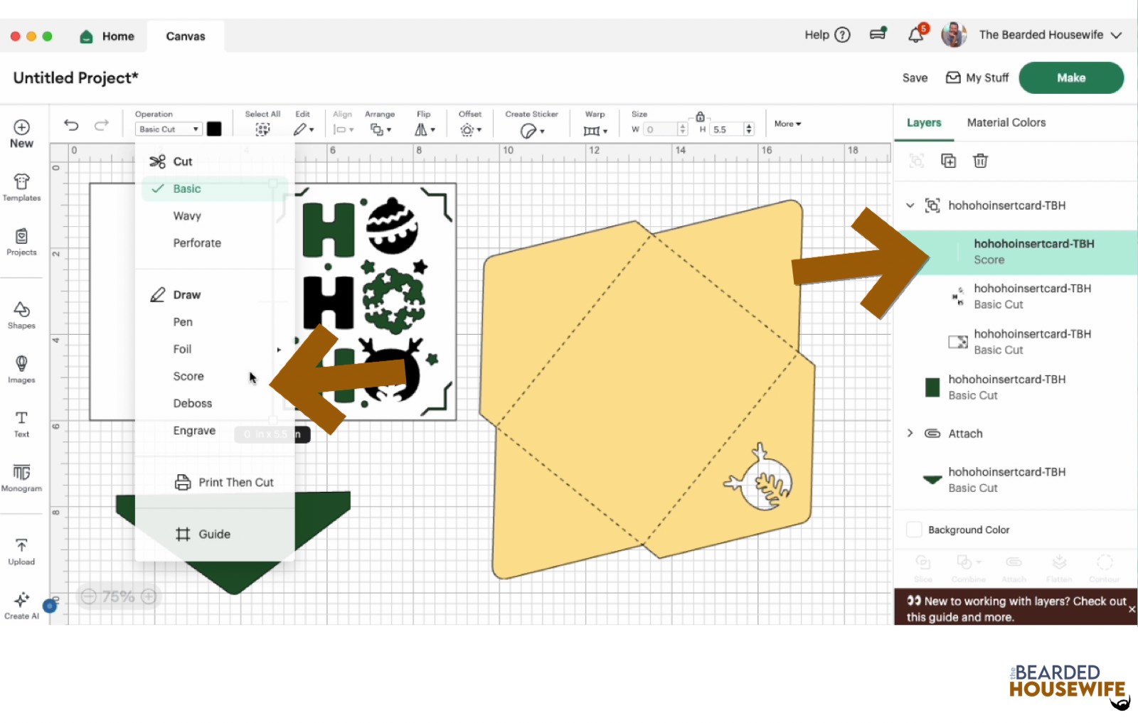 Scroll down the list in the LAYERS panel and find the card base. Click the fold line and change the fold lines to score lines by changing the OPERATION from BASIC CUT to SCORE.