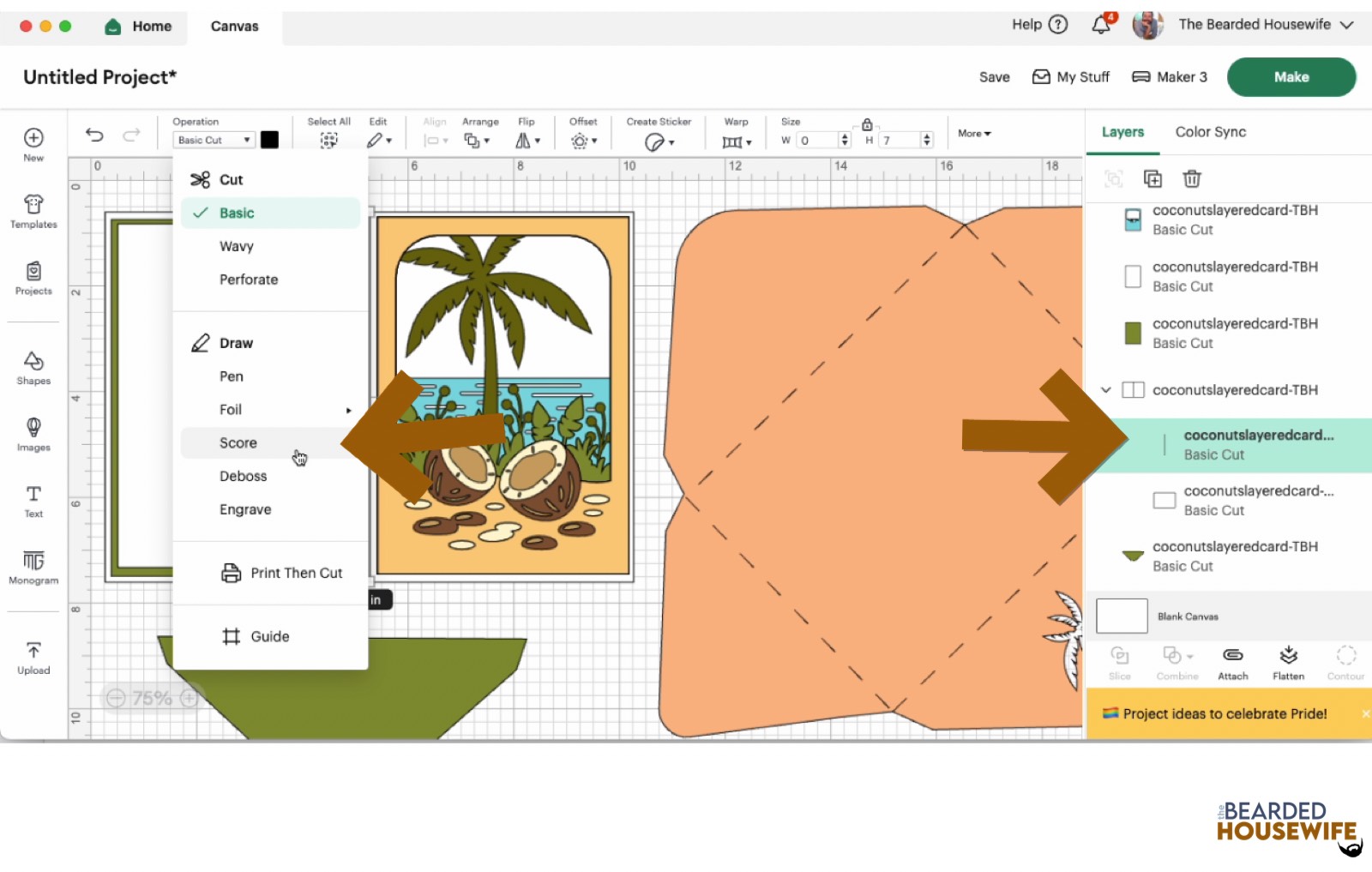Scroll down the list in the LAYERS panel and find the envelope. Click the fold line and change the fold lines to score lines by changing the OPERATION from BASIC CUT to SCORE.