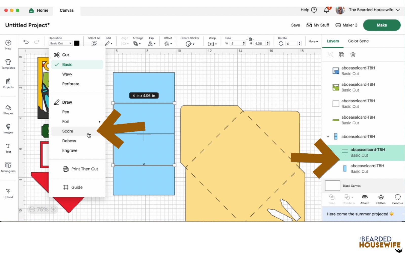 Scroll down the list in the LAYERS panel and find the envelope. Click the fold line and change the fold lines to score lines by changing the OPERATION from BASIC CUT to SCORE.