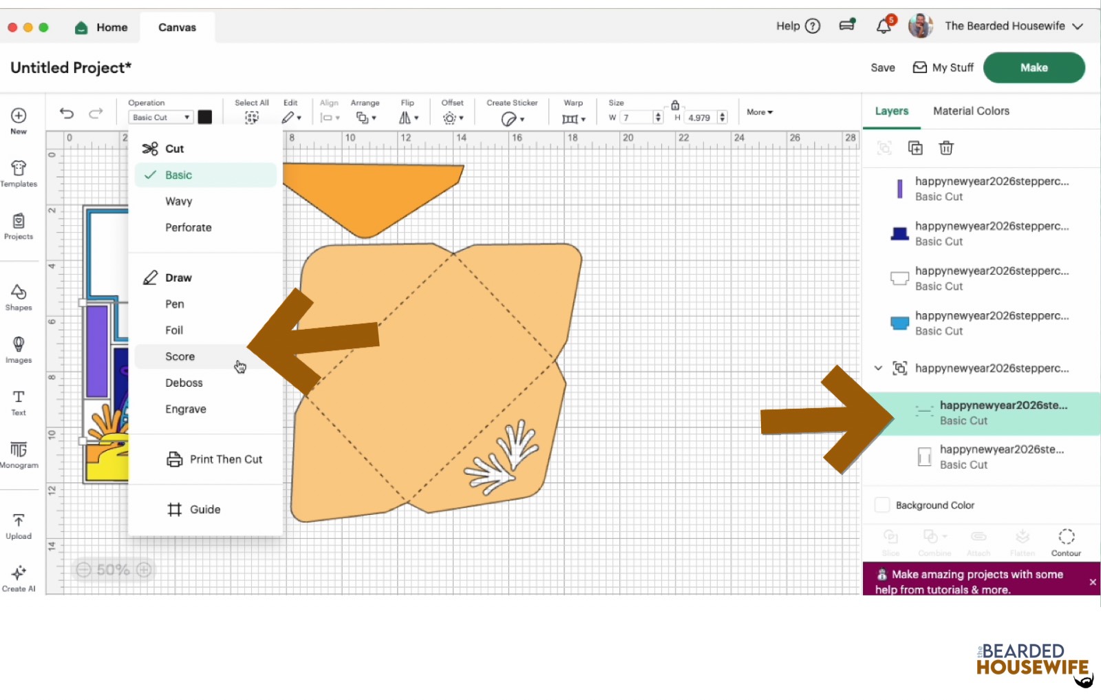 Scroll down the list in the LAYERS panel and find the envelope. Click the fold line and change the fold lines to score lines by changing the OPERATION from BASICCUT to SCORE.