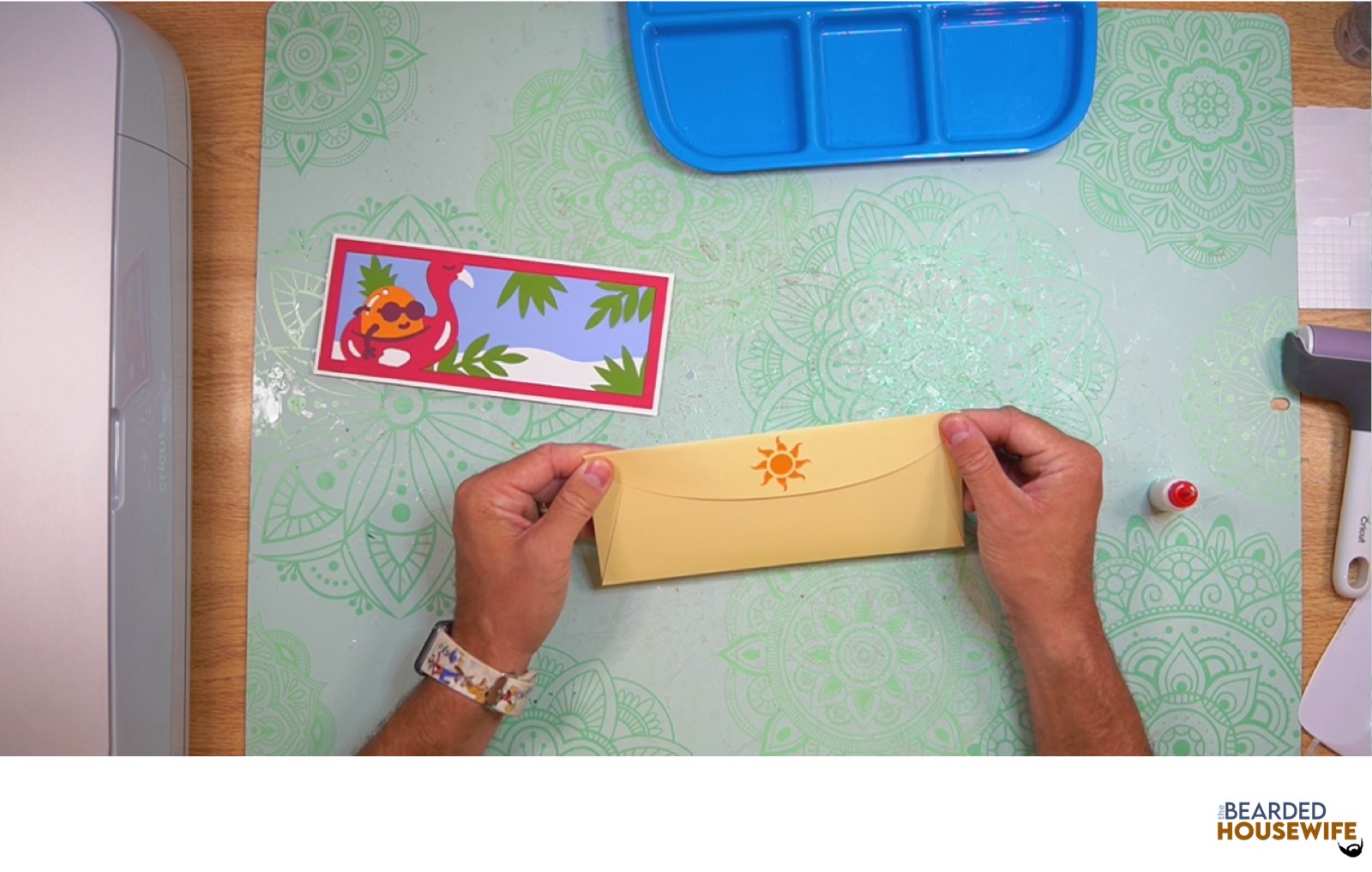 Place the inlay panel over the cutout on the envelope making sure to center it well.