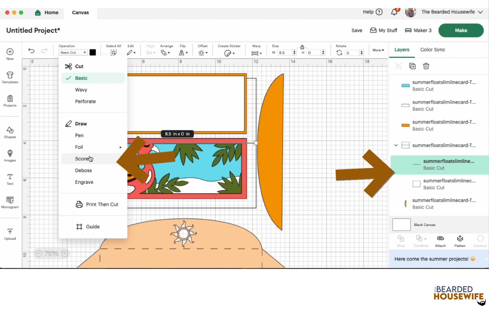 Scroll down the list in the LAYERS panel and find the envelope. Click the fold line and change the fold lines to score lines by changing the OPERATION from BASIC CUT to SCORE.