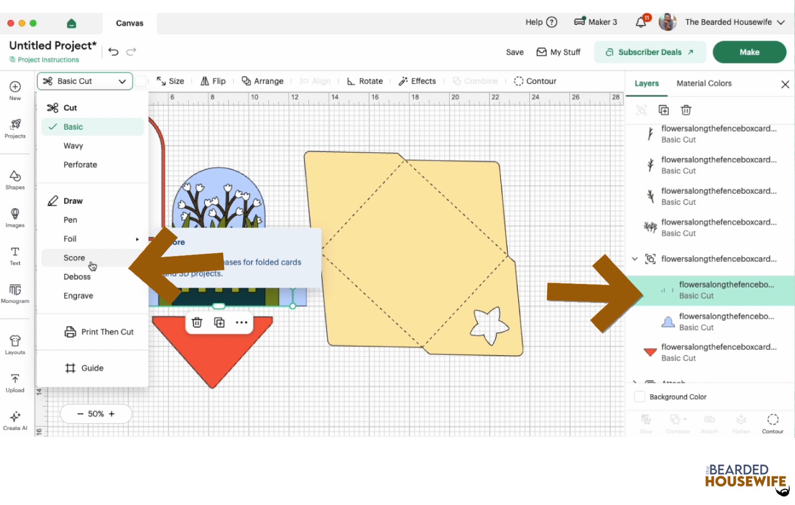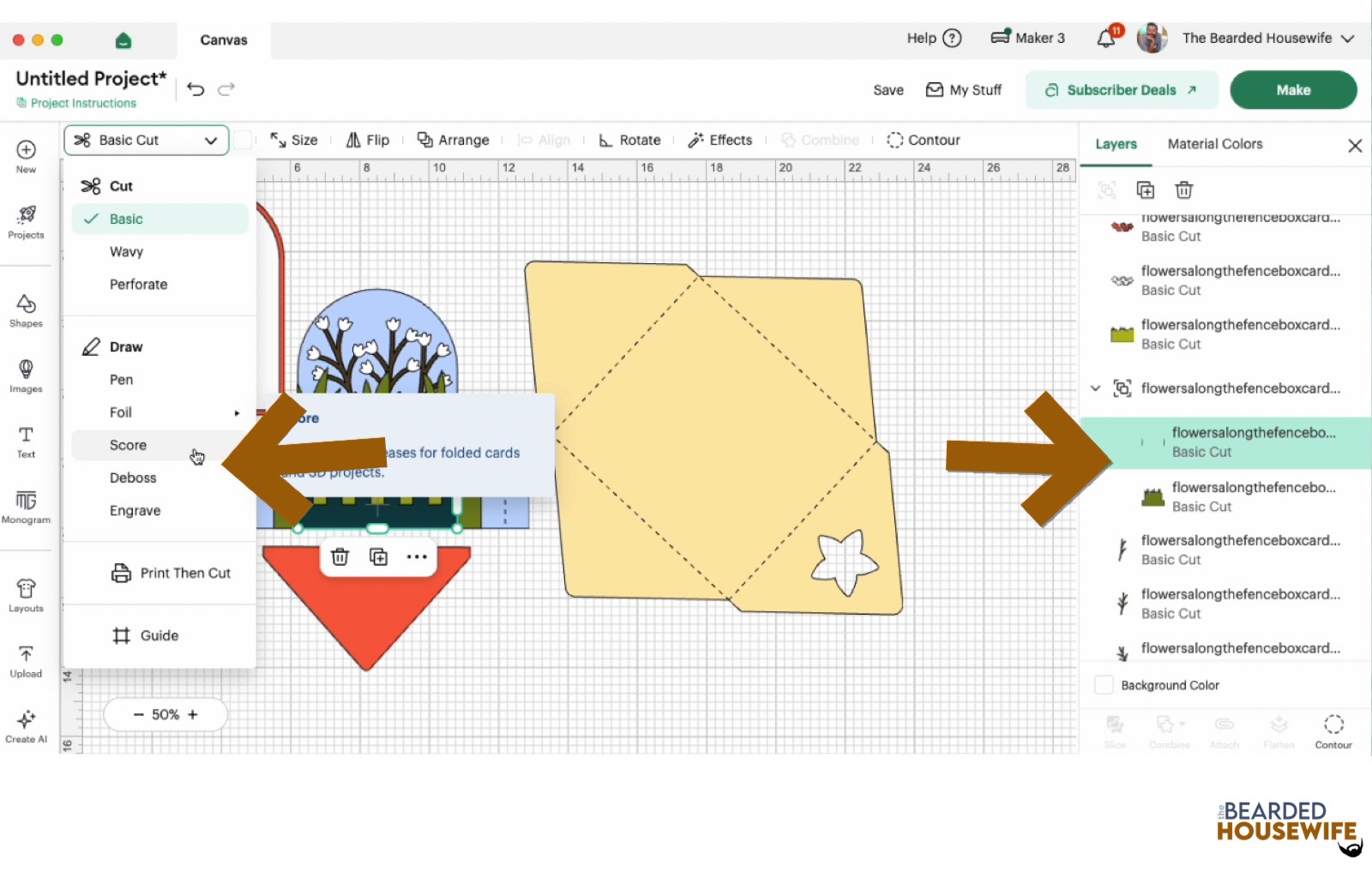Scroll down the list in the LAYERS panel and find the envelope. Click the fold line and change the fold lines to score lines by changing the OPERATION from BASIC CUT to SCORE.
