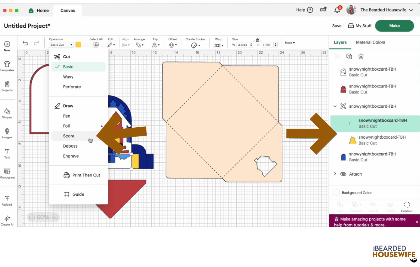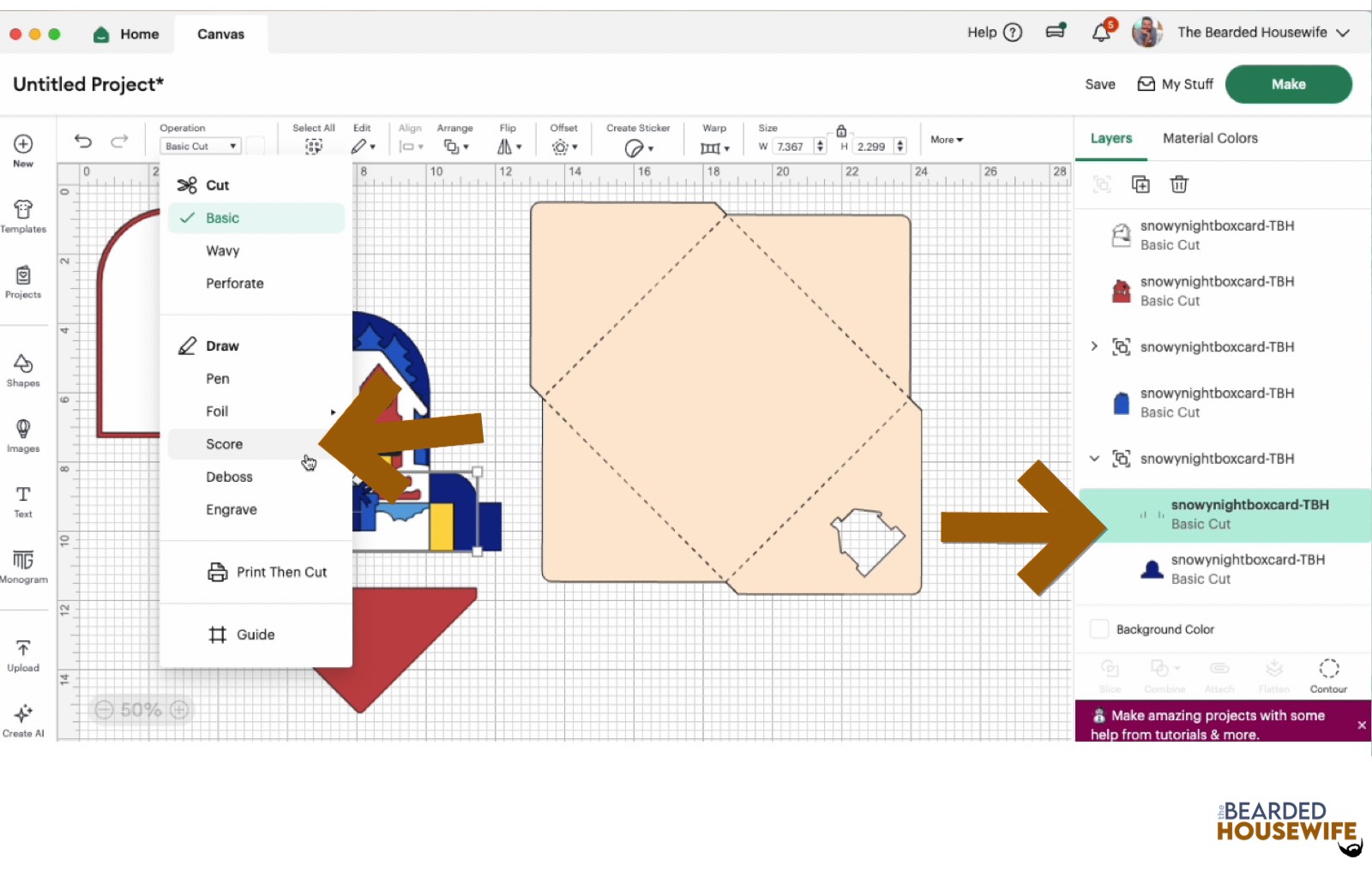 Scroll down the list in the LAYERS panel and find the envelope. Click the fold line and change the fold lines to score lines by changing the OPERATION from BASICCUT to SCORE.