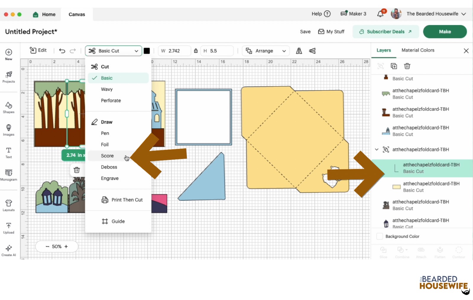 Scroll down the list in the LAYERS panel and find the envelope. Click the fold line and change the fold lines to score lines by changing the OPERATION from BASICCUT to SCORE.