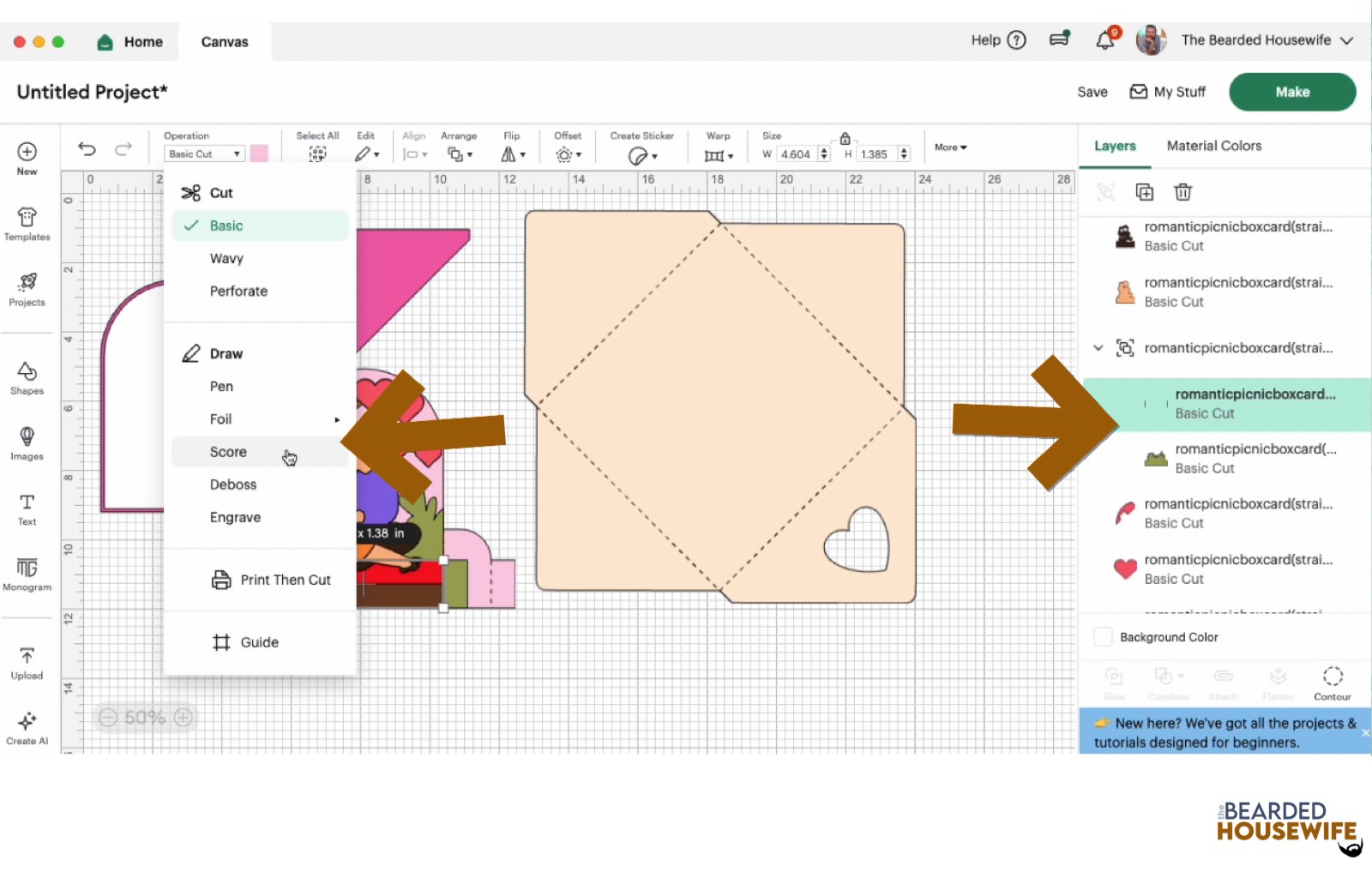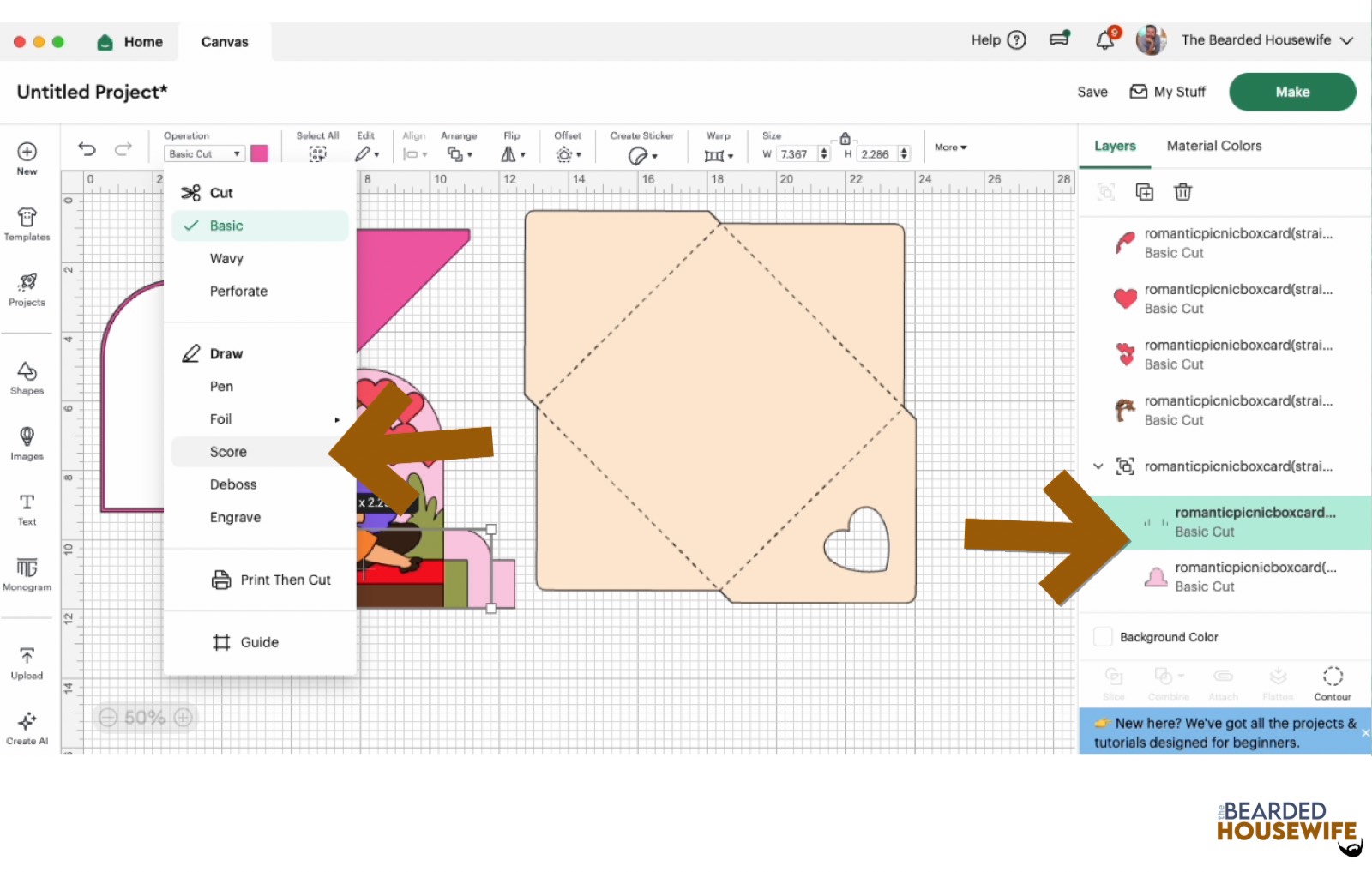 Scroll down the list in the LAYERS panel and find the envelope. Click the fold line and change the fold lines to score lines by changing the OPERATION from BASICCUT to SCORE.